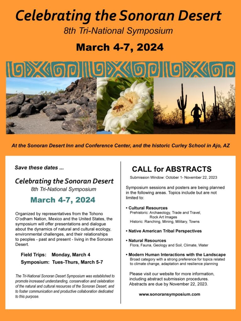 Organized by representatives from the Tohono O’odham Nation, Mexico and the United States, this biennial symposium offers presentations and dialogue about the dynamics of natural and cultural ecology, environmental challenges, and their relationships to peoples–past and present–living in the Sonoran Desert.