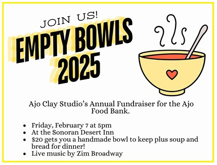 Empty Bowls Fundraiser for the Ajo Food Bank Calendar Add to Calendar Add to Timely Calendar Add to Google Add to Outlook Add to Apple Calendar Add to other calendar Export to XML When: February 7, 2025 @ 5:00 pm 2025-02-07T17:00:00-07:00 2025-02-07T17:15:00-07:00 Where: Sonoran Desert Inn Courtyard Cost: $20