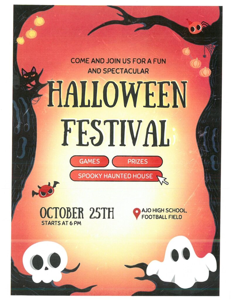 Halloween Festival Calendar Add to Calendar Add to Timely Calendar Add to Google Add to Outlook Add to Apple Calendar Add to other calendar Export to XML When: October 25, 2024 @ 6:00 pm 2024-10-25T18:00:00-07:00 2024-10-25T18:15:00-07:00 Where: Ajo High School Football Field Cost: Free