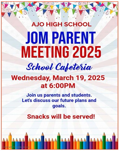 JOM Parent Meeting Calendar Add to Calendar Add to Timely Calendar Add to Google Add to Outlook Add to Apple Calendar Add to other calendar Export to XML When: March 19, 2025 @ 6:00 pm 2025-03-19T18:00:00-07:00 2025-03-19T18:15:00-07:00 Where: Ajo High School Cafeteria