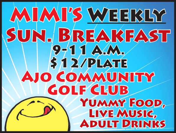 Mimi’s Weekly Sunday Breakfast Calendar Add to Calendar Add to Timely Calendar Add to Google Add to Outlook Add to Apple Calendar Add to other calendar Export to XML When: February 15, 2025 @ 9:00 am – 11:00 am 2025-02-15T09:00:00-07:00 2025-02-15T11:00:00-07:00 Where: Ajo Community Golf Course Cost: $12