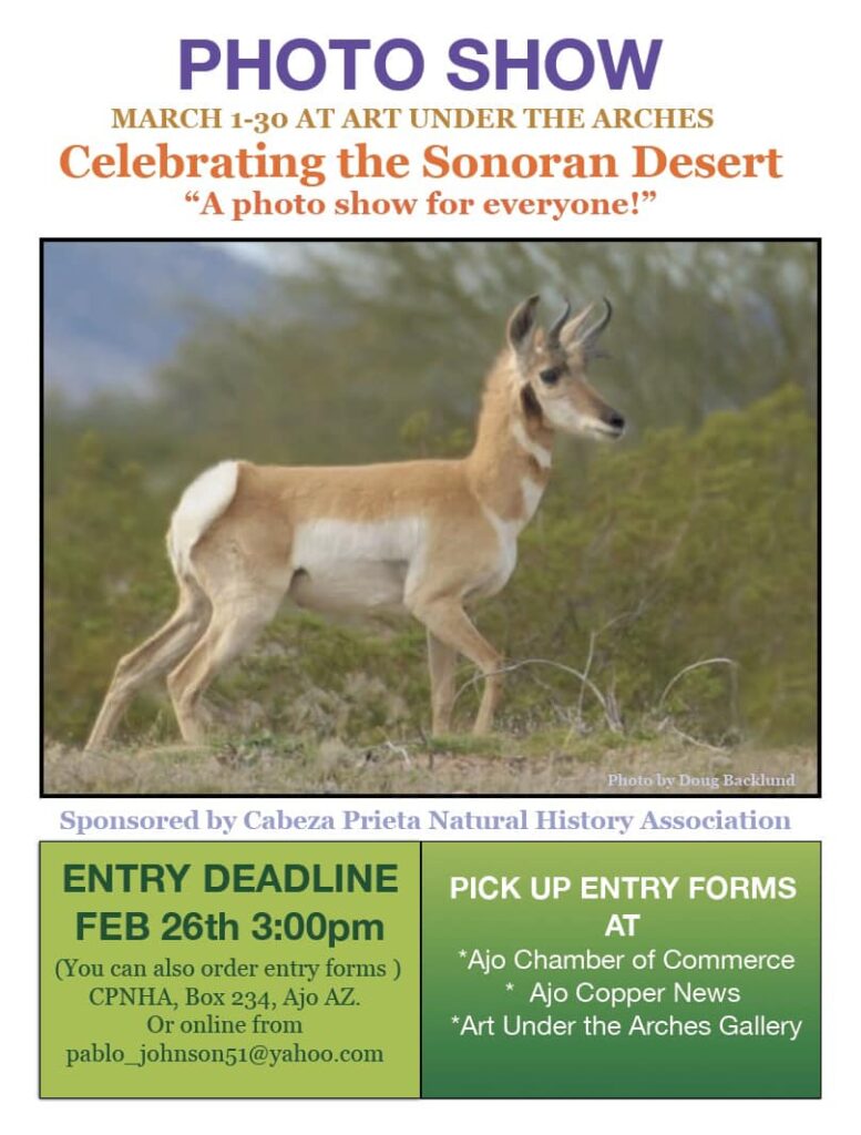 Photo Show Opening (Celebrating the Sonoran Desert) Calendar Add to Calendar Add to Timely Calendar Add to Google Add to Outlook Add to Apple Calendar Add to other calendar Export to XML When: March 7, 2025 @ 6:00 pm 2025-03-07T18:00:00-07:00 2025-03-07T18:15:00-07:00 Where: Art Under the Arches Ajo Plaza