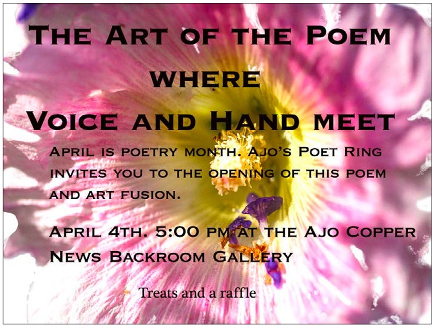 Poetry & Art Calendar Add to Calendar Add to Timely Calendar Add to Google Add to Outlook Add to Apple Calendar Add to other calendar Export to XML When: April 4, 2025 @ 5:00 pm 2025-04-04T17:00:00-07:00 2025-04-04T17:15:00-07:00 Where: Ajo Copper News Backroom Gallery Cost: Free