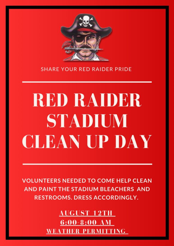 Red Raider Stadium Clean Up Day Calendar Add to Calendar Add to Timely Calendar Add to Google Add to Outlook Add to Apple Calendar Add to other calendar Export to XML When: August 12, 2023 @ 6:00 am – 8:00 am 2023-08-12T06:00:00-07:00 2023-08-12T08:00:00-07:00 Where: AHS Football Field