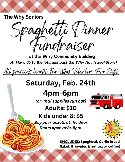 Spaghetti Dinner Fundraiser Calendar Add to Calendar Add to Timely Calendar Add to Google Add to Outlook Add to Apple Calendar Add to other calendar Export to XML When: February 24, 2024 @ 4:00 pm – 6:00 pm 2024-02-24T16:00:00-07:00 2024-02-24T18:00:00-07:00 Where: Why Community Building Cost: $10/$5