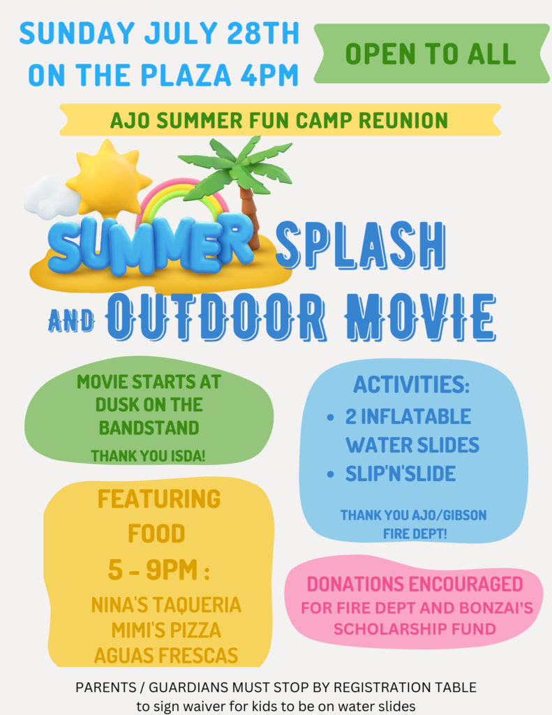 Summer Splash & Outdoor Movie Calendar Add to Calendar Add to Timely Calendar Add to Google Add to Outlook Add to Apple Calendar Add to other calendar Export to XML When: July 28, 2024 @ 4:00 pm 2024-07-28T16:00:00-07:00 2024-07-28T16:15:00-07:00 Where: Ajo Plaza